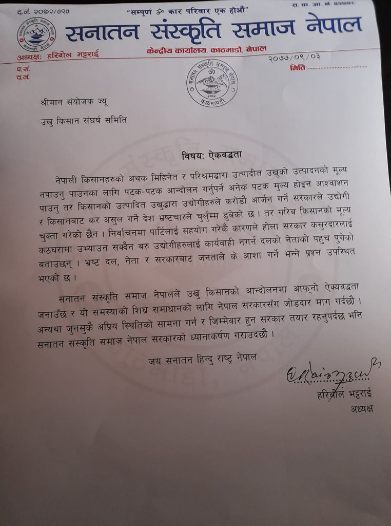 उखु किसानको आन्दोलनमा सनातन संस्कृति समाज नेपालको ऐक्यबद्धता